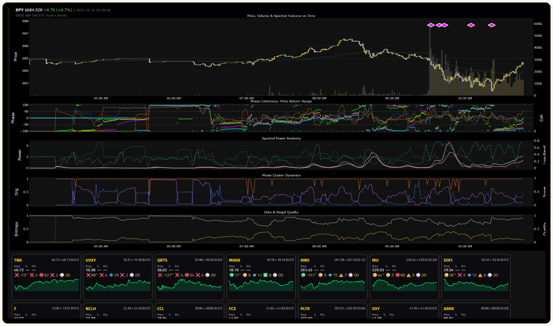 We process market data with proprietary spectral signal processing techniques to extract phase coherence, harmonic convergence, and other algorithmic signature metrics.